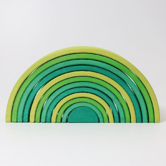 The Rainbow is really versatile and ideal for small children! Toddlers stack, sort and build and as the children get older they will use it as a cradle for dolls, as fence for animals, like a tunnel or bridge for vehicles, as a house for dwarfs and dollhouse dolls, build amazing sculptures… this rainbow will always be integrated in playing with a lot of fantasy.