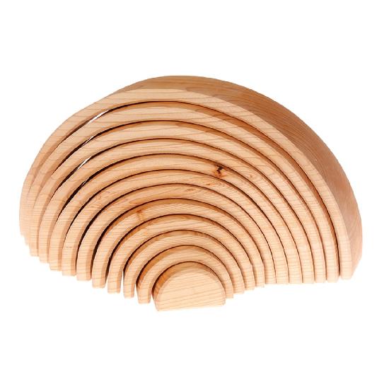 The Rainbow is really versatile and ideal for small children! Toddlers stack, sort and build and as the children get older they will use it as a cradle for dolls, as fence for animals, like a tunnel or bridge for vehicles, as a house for dwarfs and dollhouse dolls, build amazing sculptures… this rainbow will always be integrated in playing with a lot of fantasy.