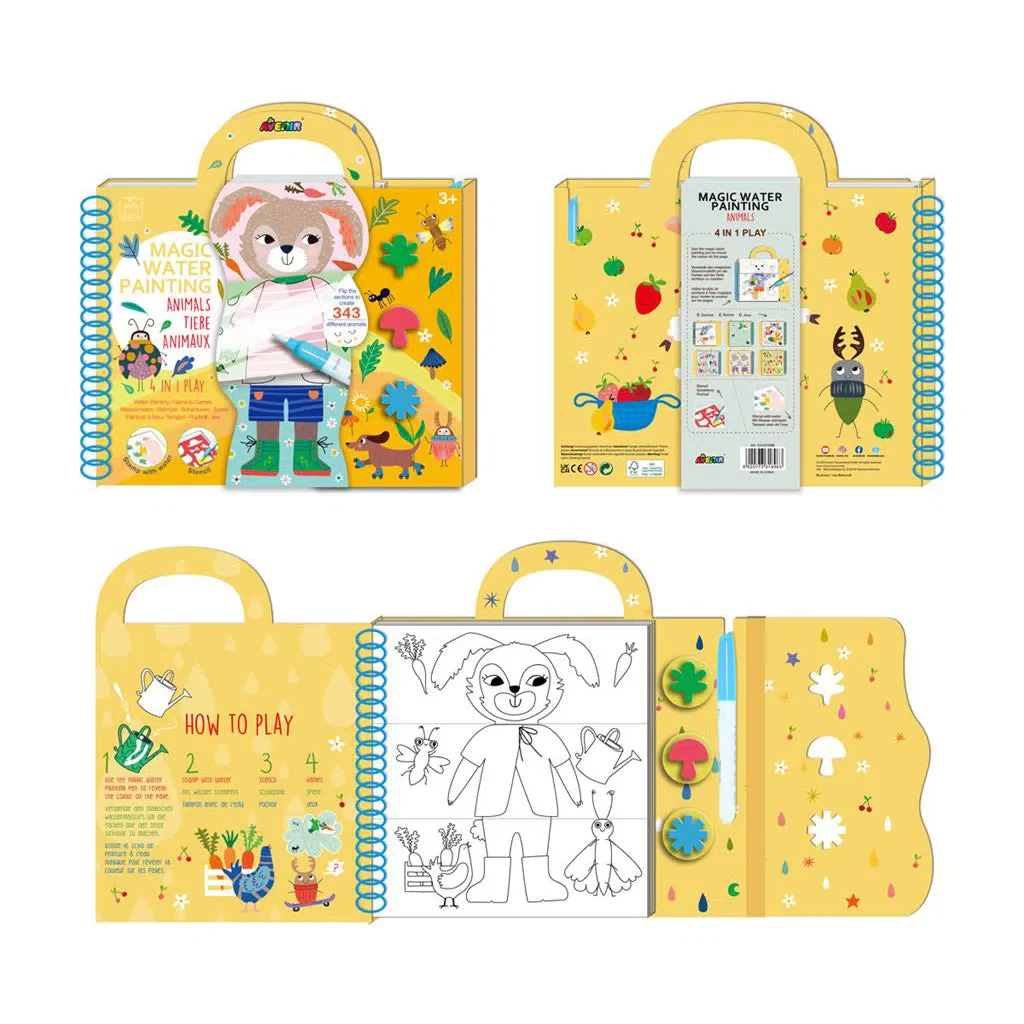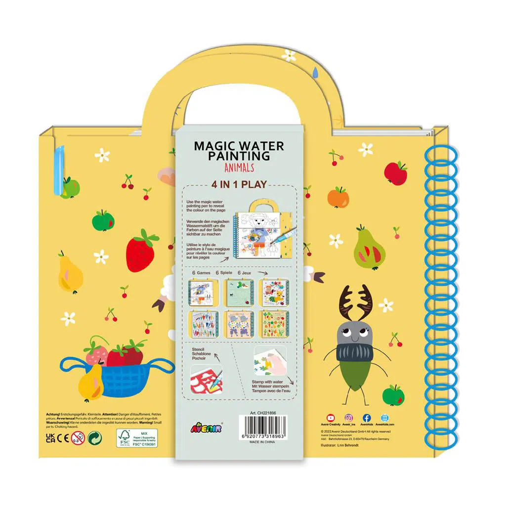 Vul de magische pen met water en gebruik ze op de herbruikbare afbeeldingen. De tekeningen krijgen kleur wanneer ze in contact komen met water. Geen gemors! Bevat 1 magische waterpen, 6 herbruikbare tekeningen, spelletjes en herbruikbare stickers.