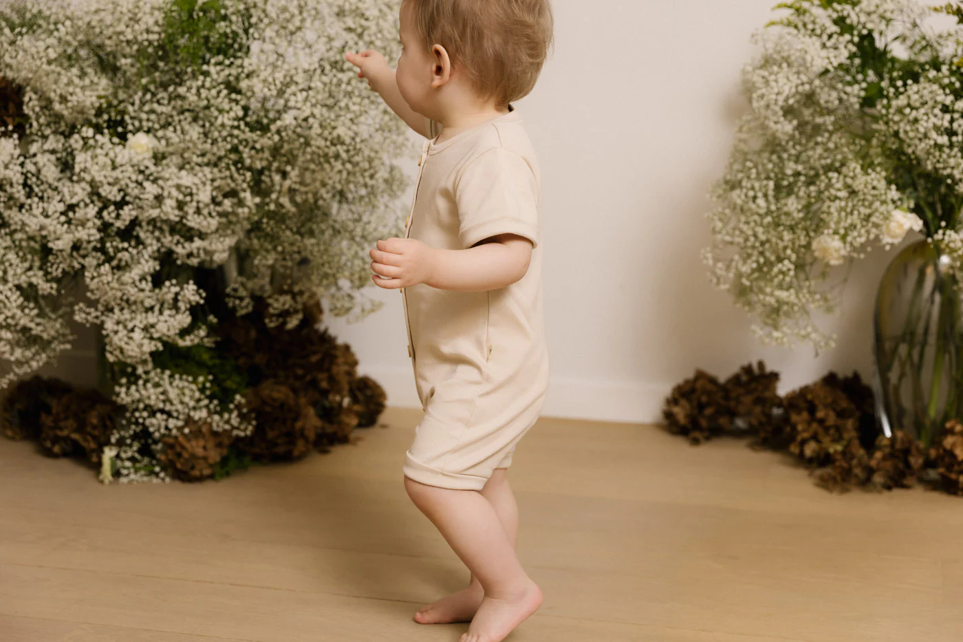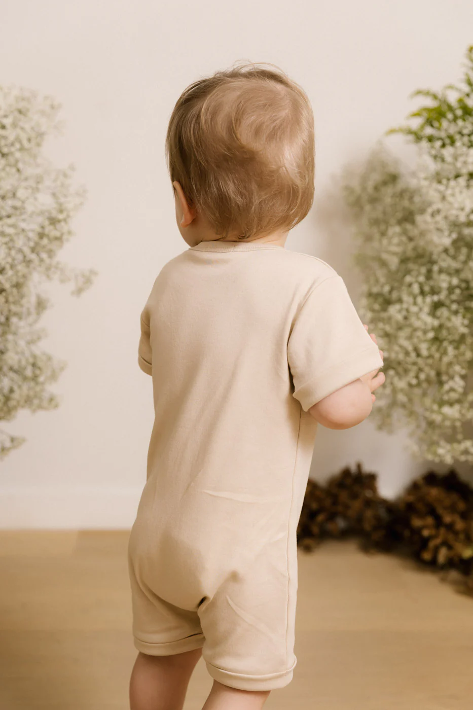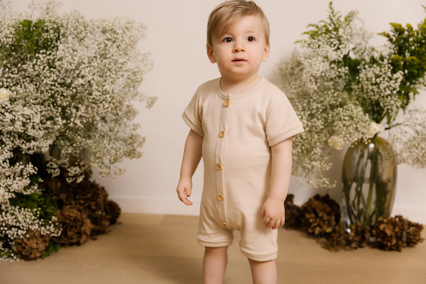 The romper with detailed wooden buttons on the chest is designed with rolled sleeves & legs that measure just above the knee. It’s a classic and playful design, perfect for summer days.
