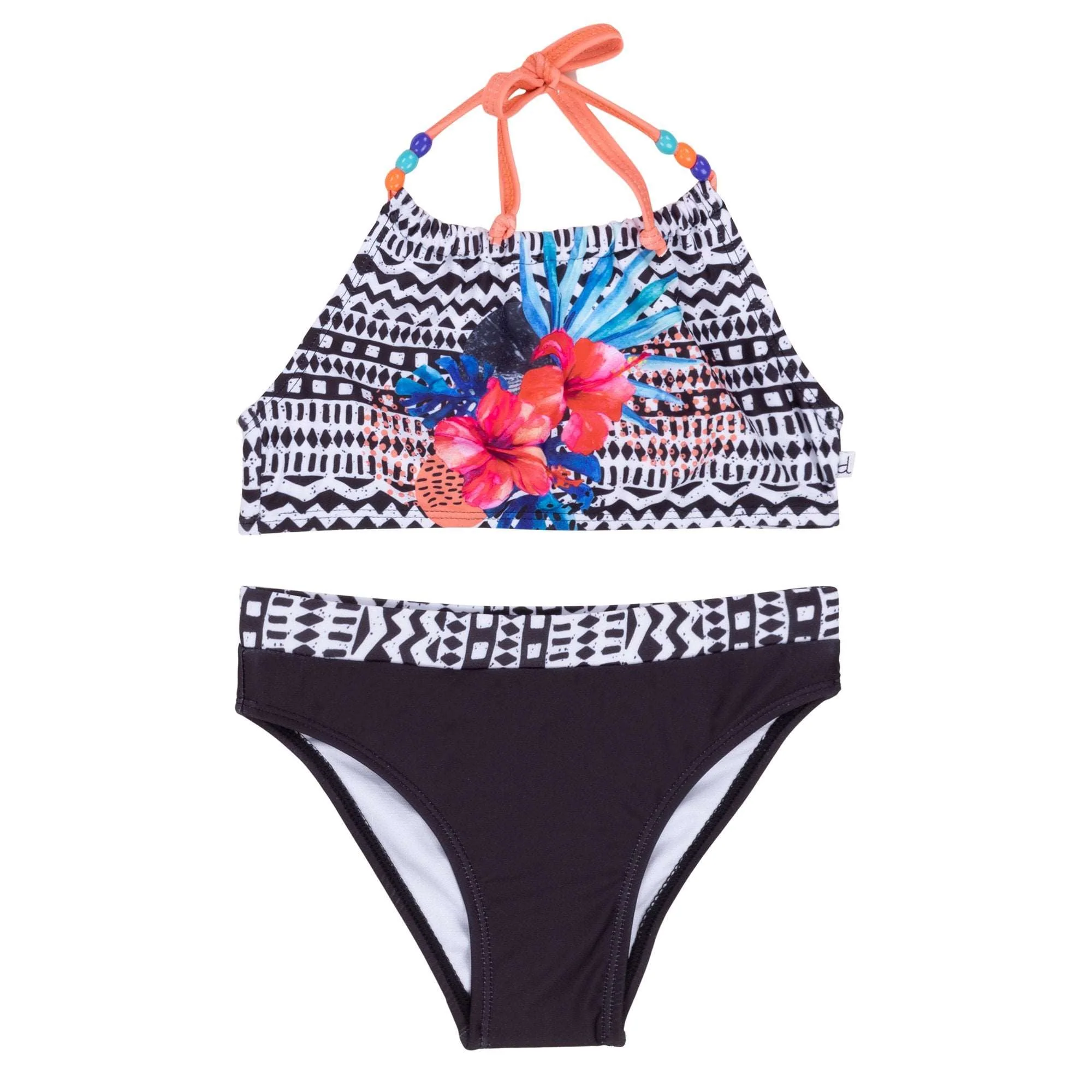 Des fleurs aux couleurs vives et des bretelles avec des billes ajoutent de la couleur et du style à ce bikini à imprimé aztèque noir et blanc. Le maillot de bain deux pièces comprend un haut à dos nu avec un imprimé noir et blanc, des bretelles de couleur contrastante et un joli imprimé floral sur la poitrine. Il est associé à un bas de bikini confortable de couleur unie avec une bande imprimé à la taille.