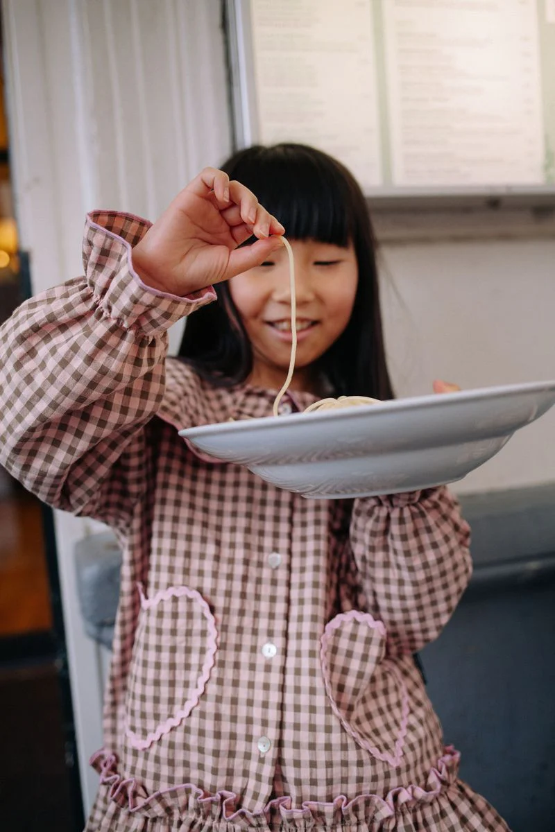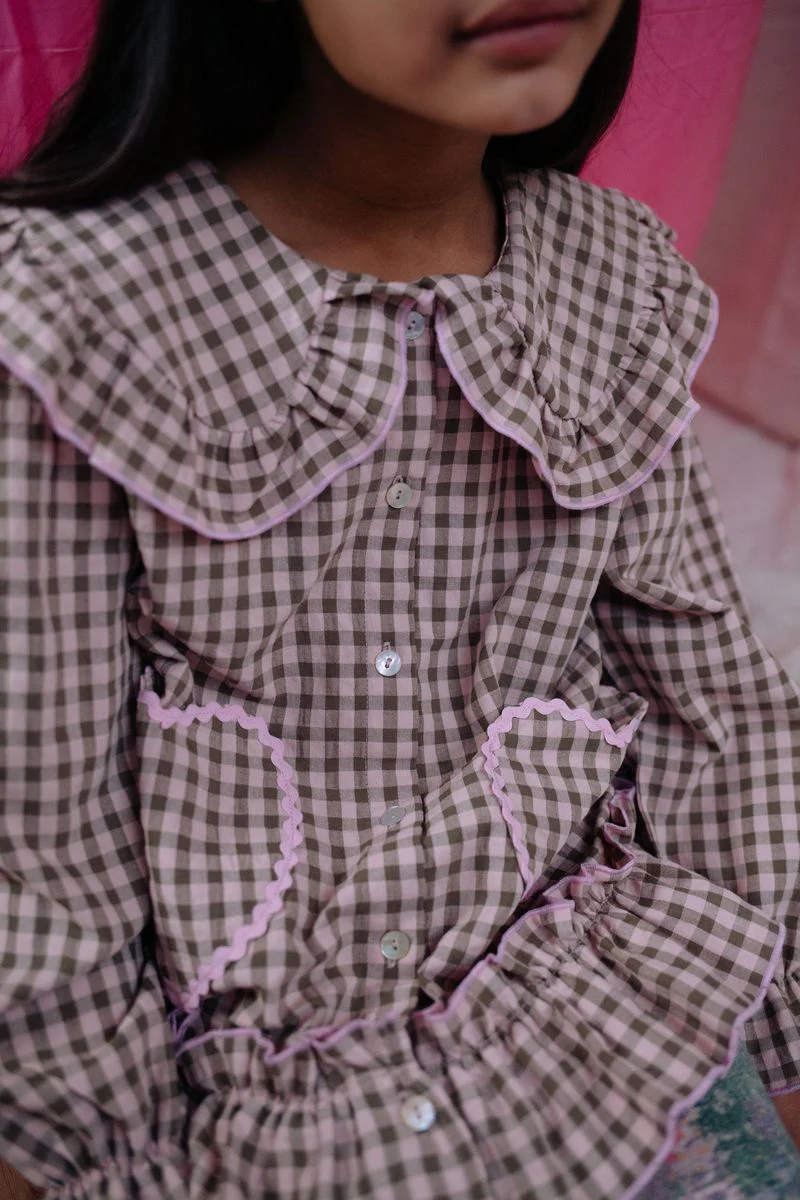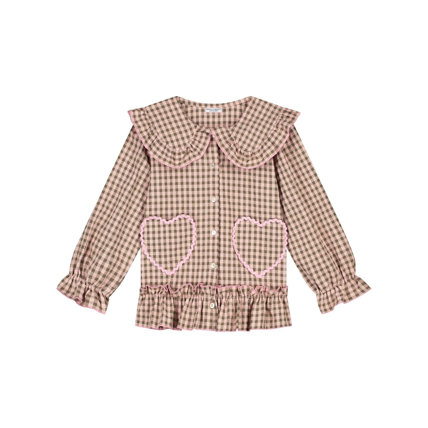 Ce charmant chemisier arbore un motif vichy intégral et des poches brodées en forme de cœur pour une touche ludique. Avec ses bordures à volants doux et son col affirmé, c’est la pièce idéale pour une tenue habillée ou décontractée.