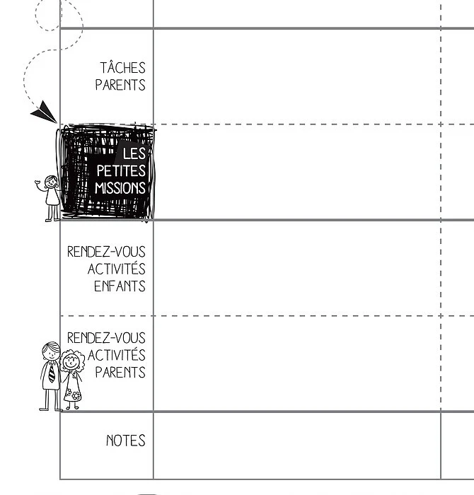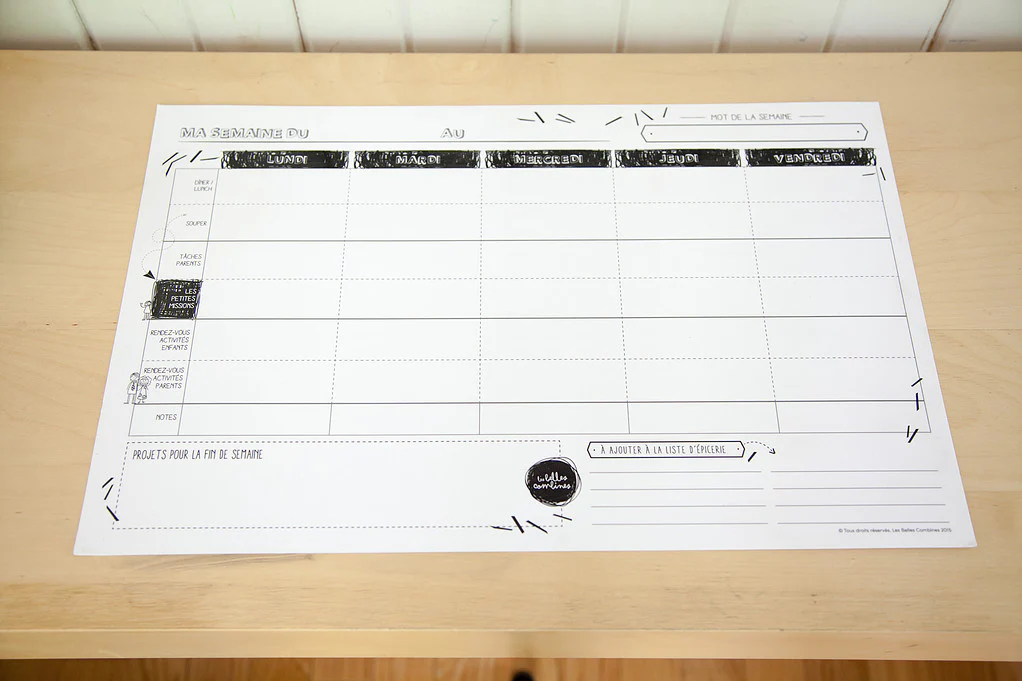 Une famille fait et vit mille et une choses chaque semaine. D’où l grande utilité de ce planificateur hebdomadaire tout aussi amusant et jolie que pratique. À l’aide d’un crayon effaçable, on y note les repas de la semaine, les activités et rendez-vous de chacun, les tâches ménagères des parents et « les petites missions » des enfants.