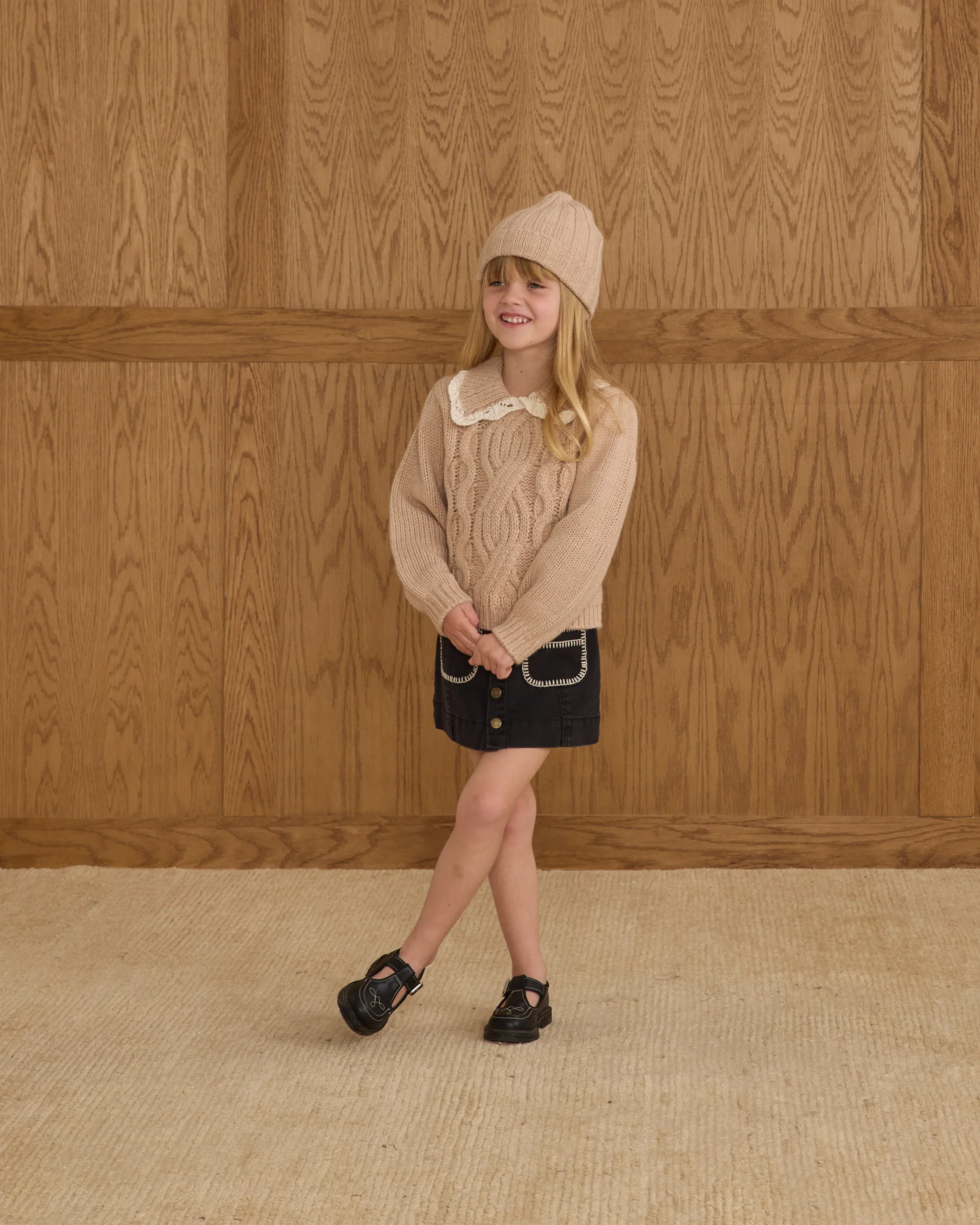 Notre pull Alice est un pull douillet doté d’un col côtelé détaillé et d’un col en crochet. Avec un devant en tricot torsadé et des manches bouffantes froncées.