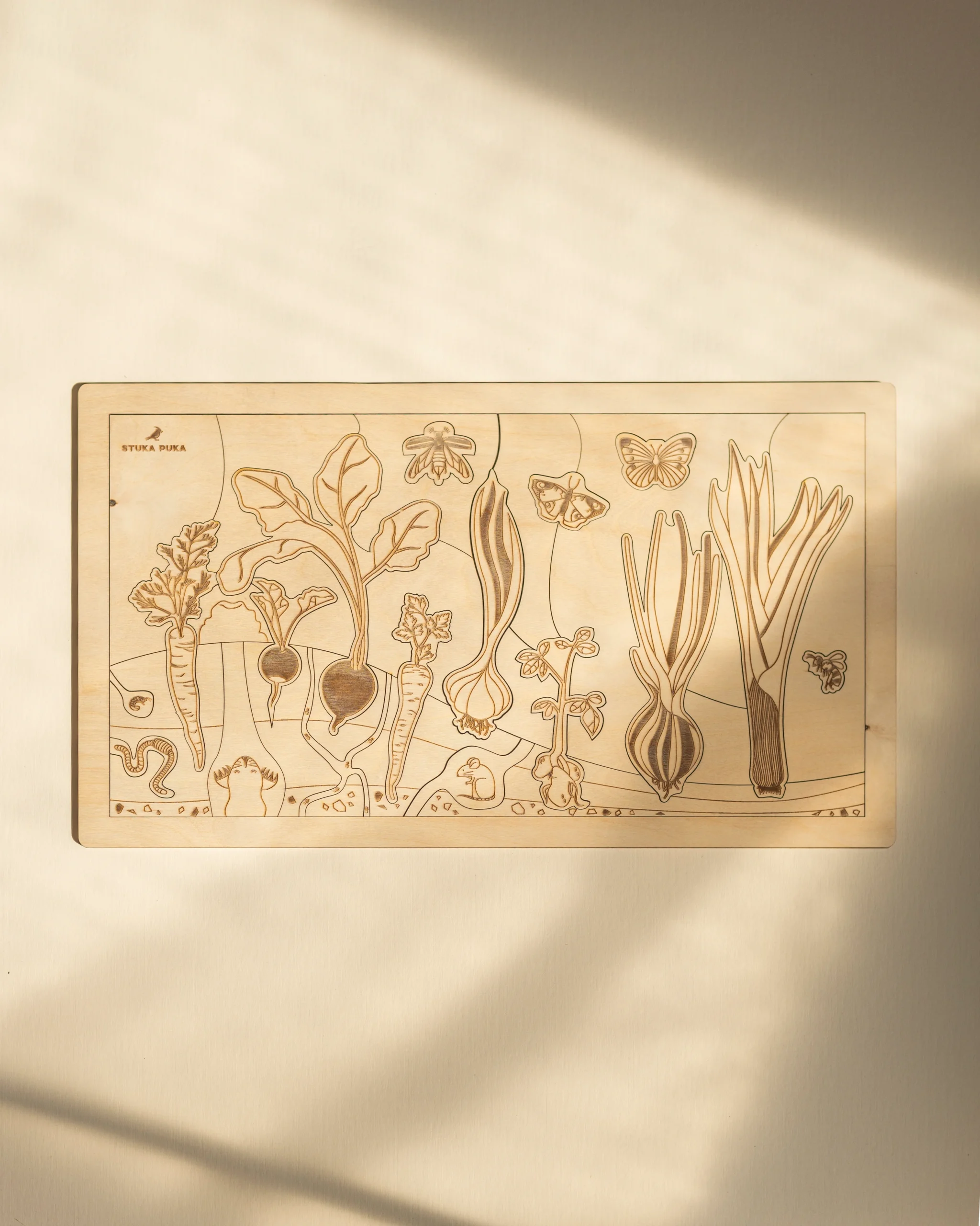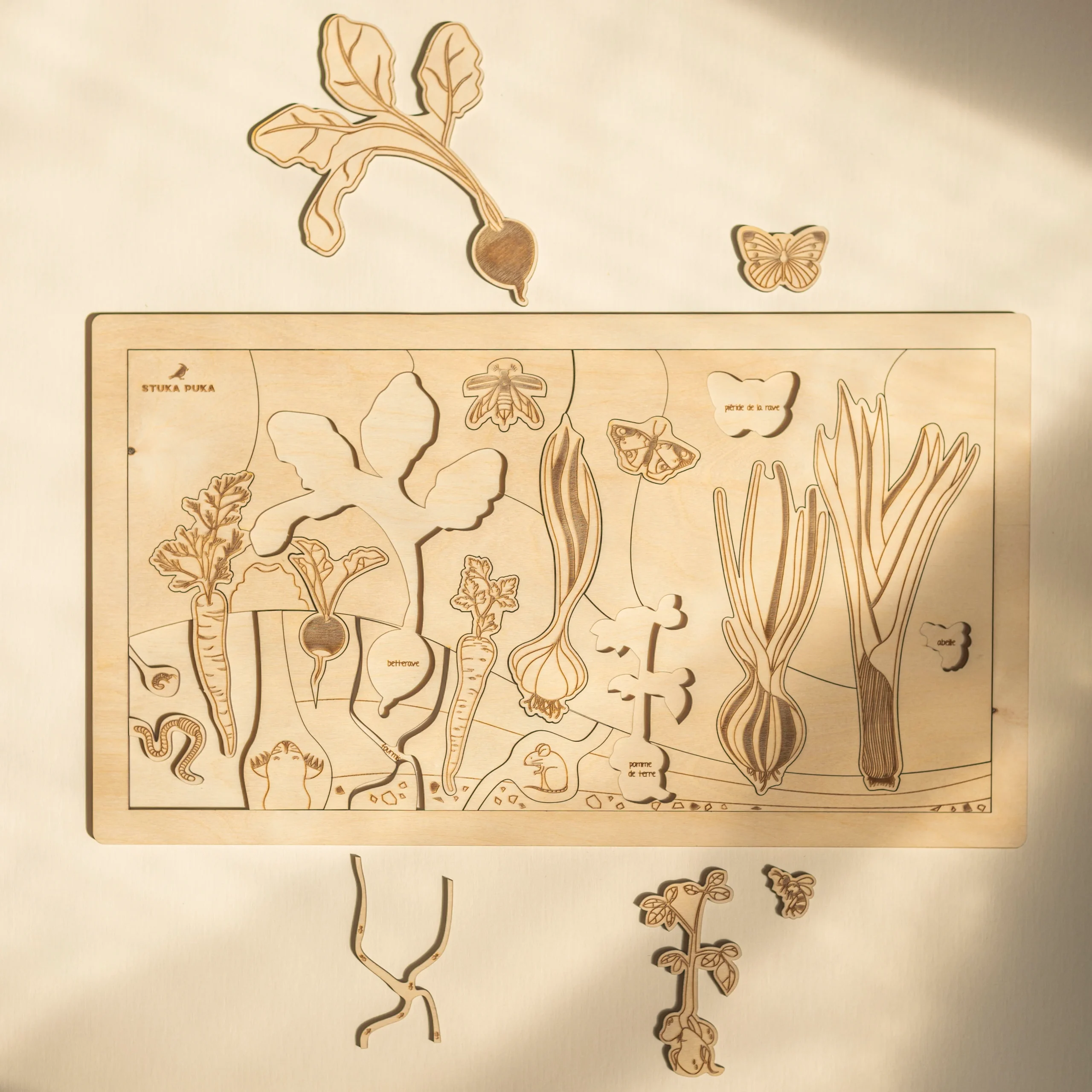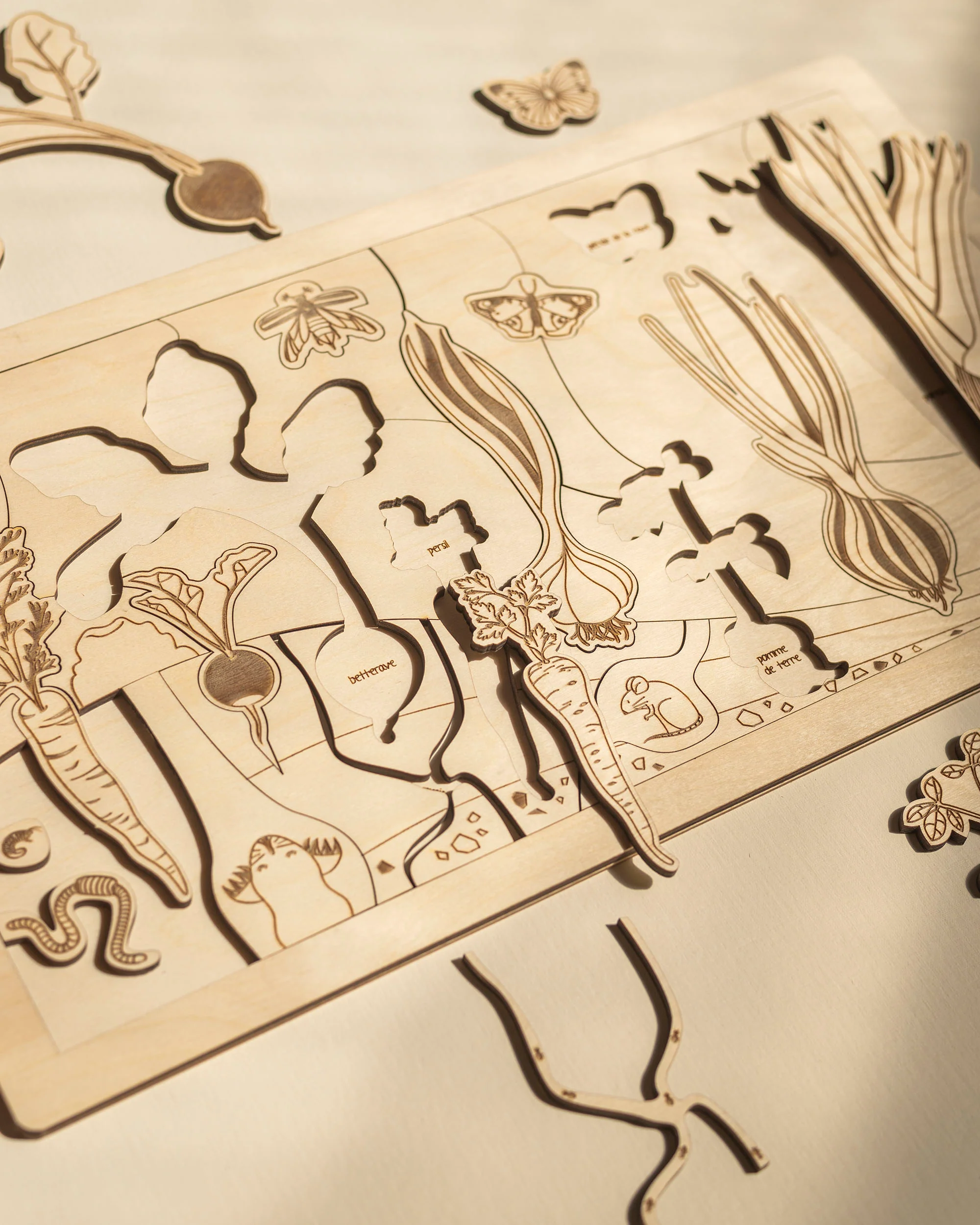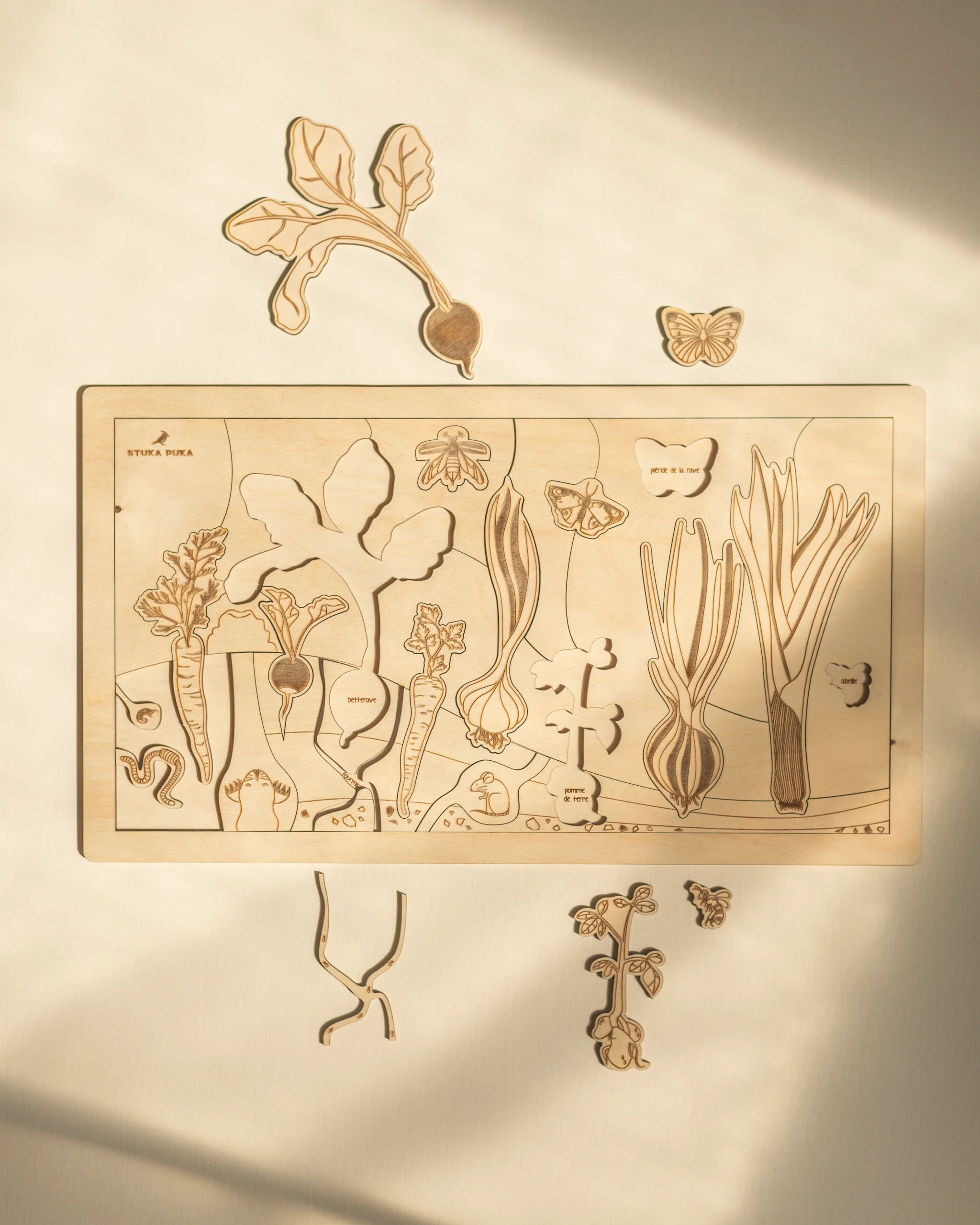 Qui est prêt pour la première récolte de l’année? Avec ce magnifique puzzle en bois Jardin secret, votre ptit mosüs pourra explorer les délicieux légumes qui poussent dans le jardin, apprendre les noms des papillons, distinguer les légumes par les feuilles, voir ce qui vit dans le sol … puis en faire de savoureux salade végétarienne!