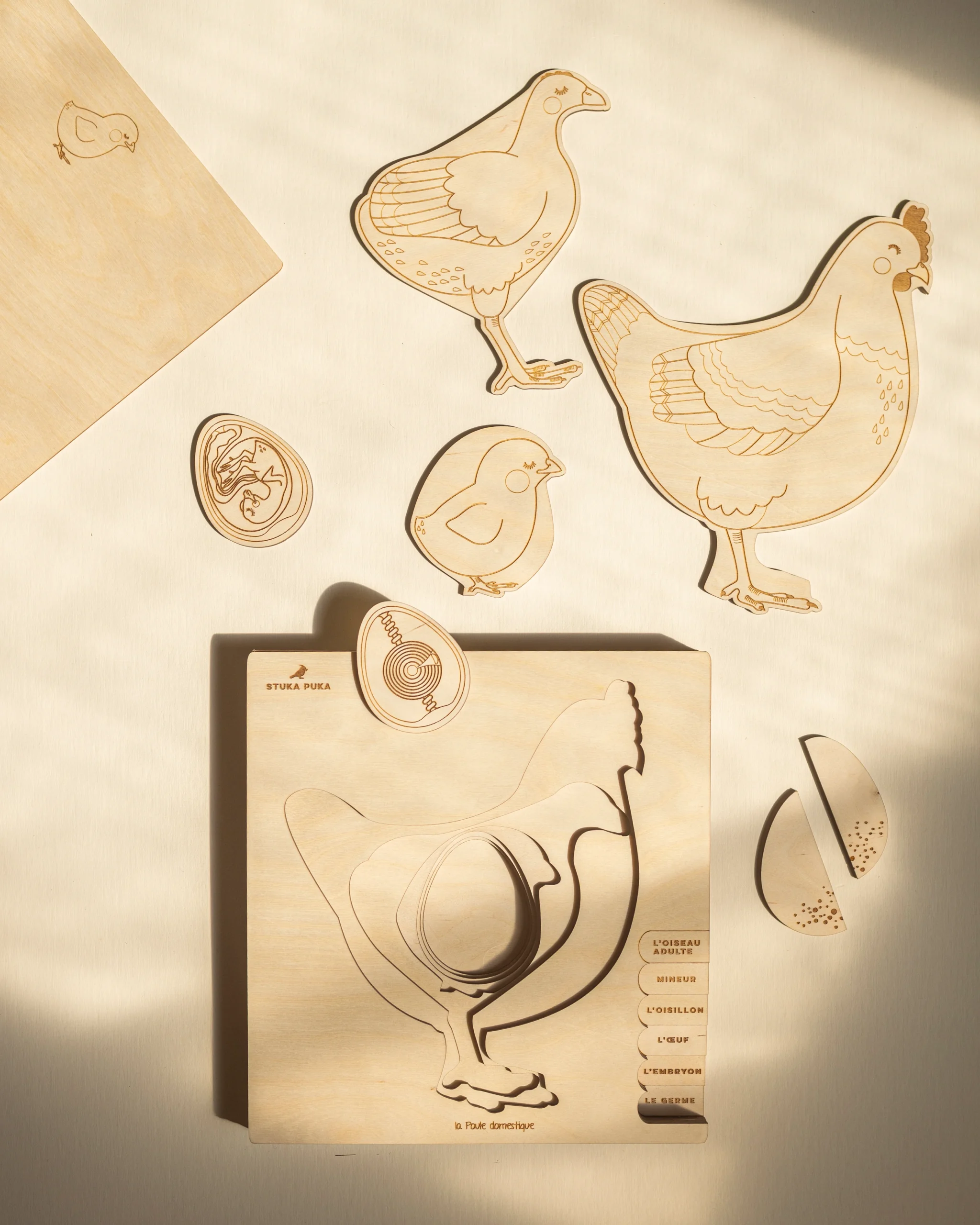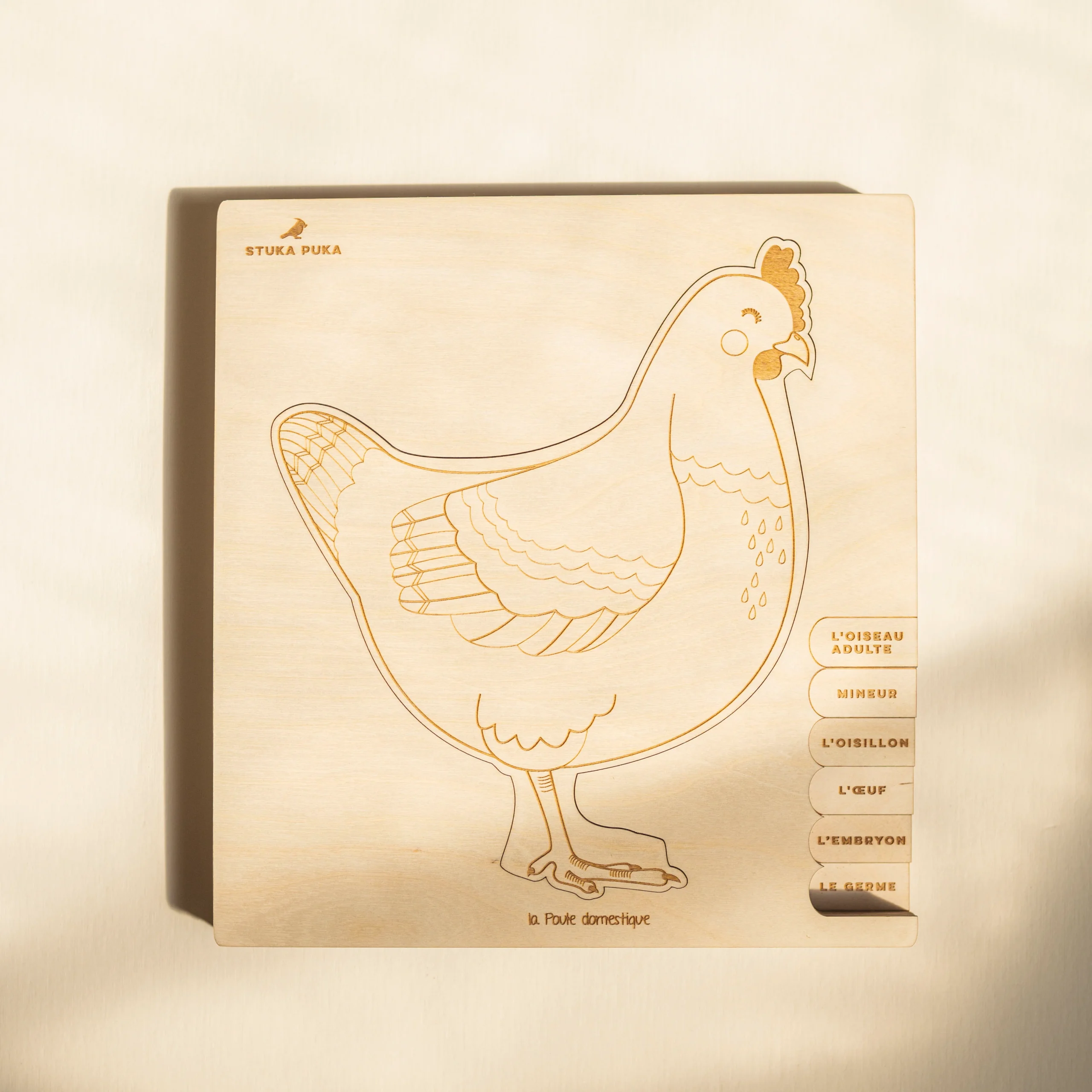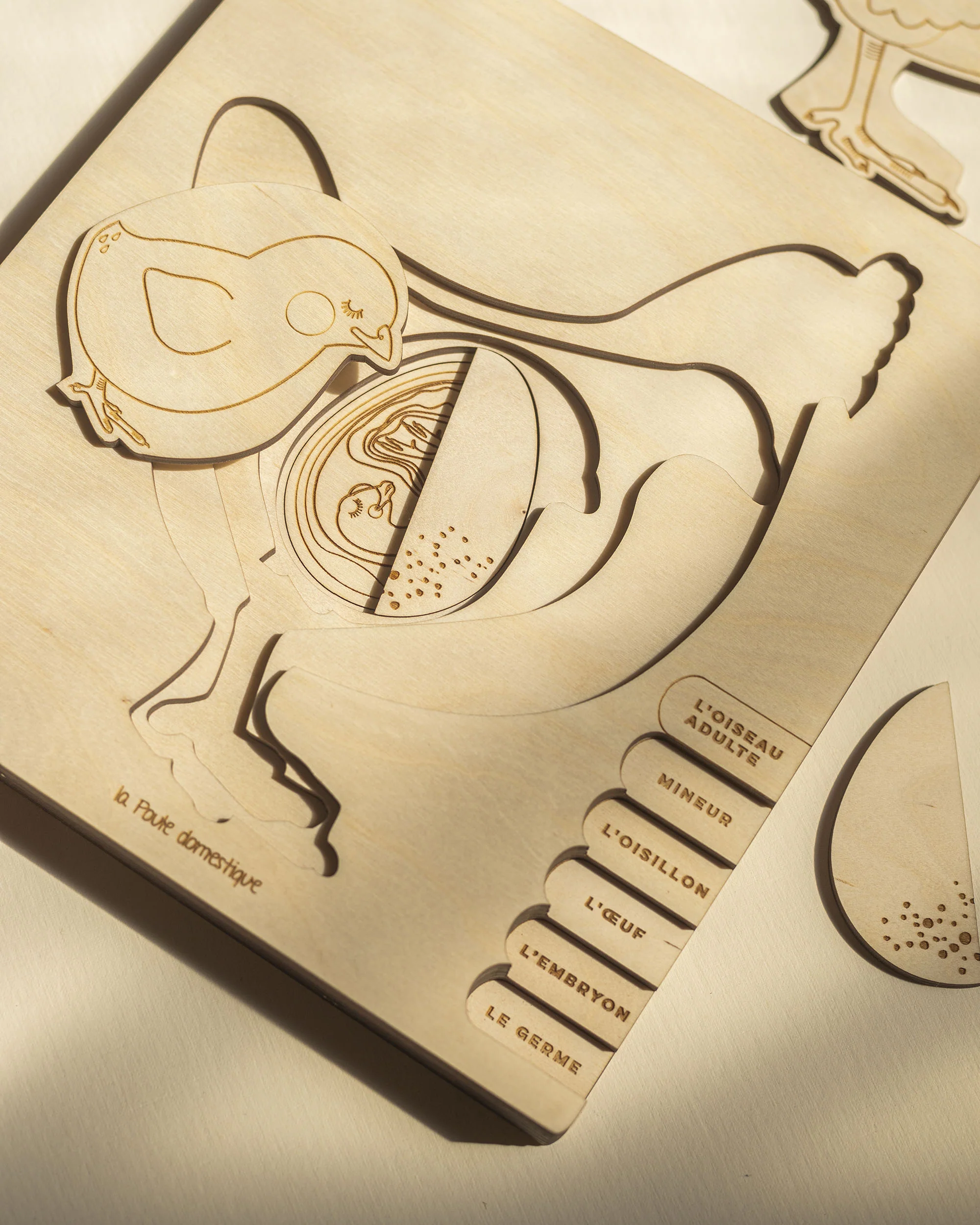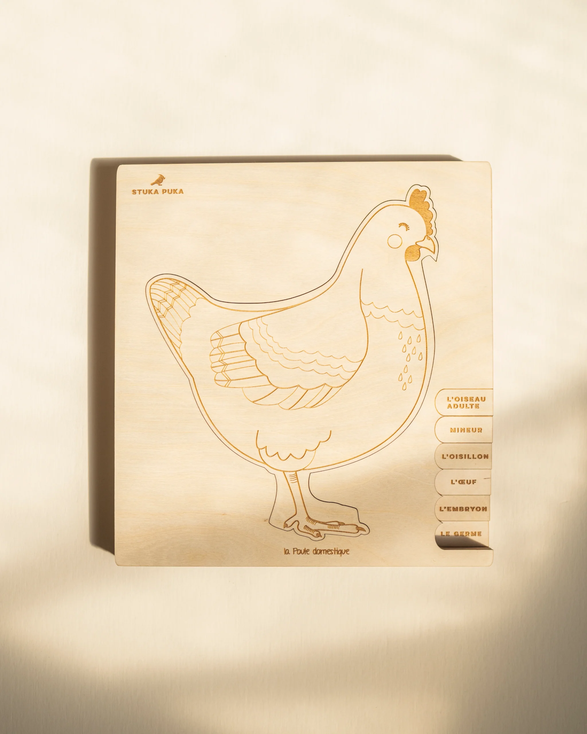 Qu’est-ce que c’était en premier, l’œuf ou la poule ? Vous pouvez maintenant voir ce qu’il y a à l’intérieur de cet œuf par vous-même et apprendre à votre tout-petit. Le puzzle en bois le cycle de la poule est un merveilleux jouet éducatif pour apprendre aux enfants tout sur les poulets. Avec 6 couches différentes de bois naturel, le puzzle montre comment l’embryon de poulet est construit, comment il éclot et se développe en un jeune poussin, puis en un poulet adulte. C’est fascinant, éducatif et amusant! Chaque puzzle est accompagné d’une petite brochure contenant des détails intéressants sur le sujet.