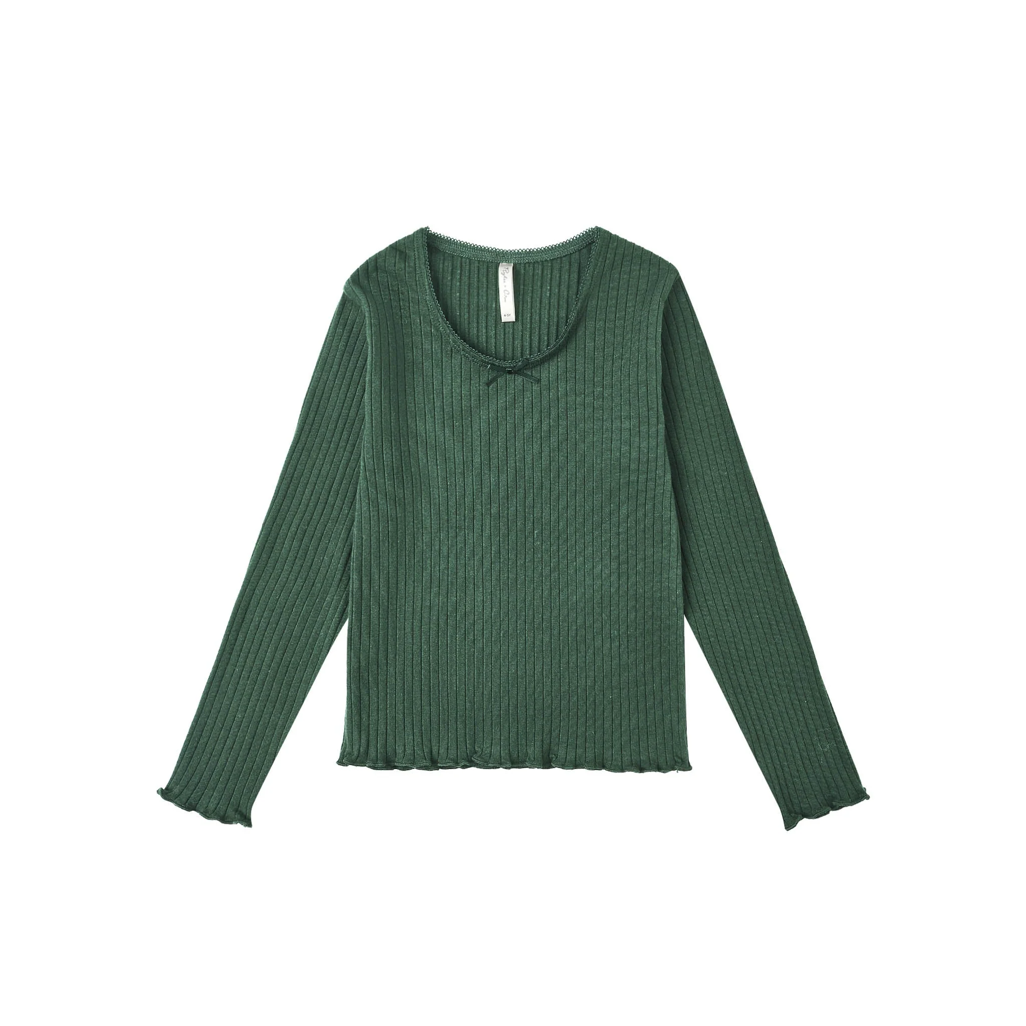 Haut côtelé à manches longues avec un ourlet délicat à bords ondulés, une encolure bordée de dentelle et un joli nœud en satin.