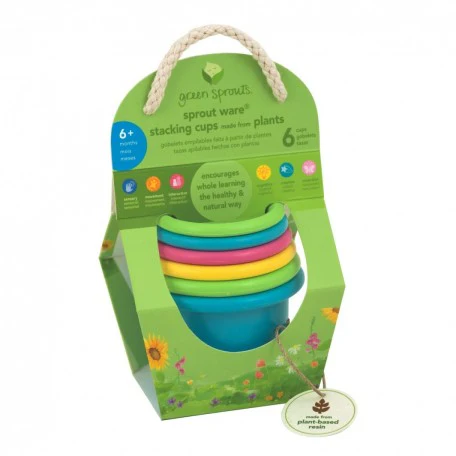 Ensemble de 6 gobelets empilables d’origine biologique fabriqués en amidon PSM végétal. Troués, ils sont amusants et parfaits pour les jeux dans la baignoire, la piscine ou le sable. 6 mois et +