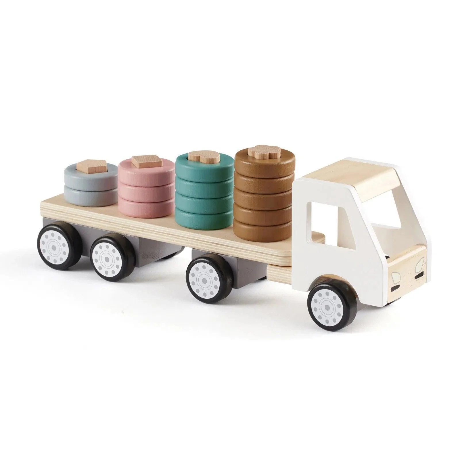 Houten vrachtwagen. De aanhanger van de vrachtwagen heeft vier pinnen in verschillende vormen waarop je ringen kunt stapelen in verschillende hoogtes en combinaties. Stimuleert de motoriek, het logisch denken, de precisie en het kleurenzicht.