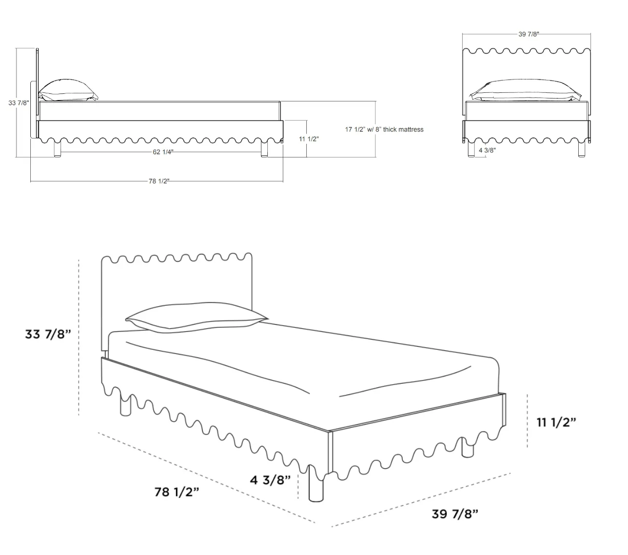- Fits a standard twin size mattress (not included) :74 ½ » L x 38 ¼ » W x 8″ Thick
