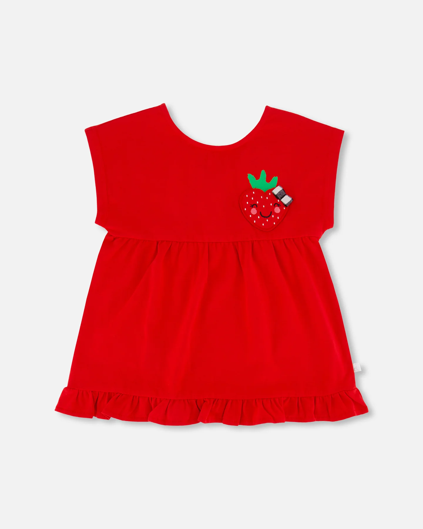 Le haut long avec volants rouge éclatant coton biologique est absolument adorable avec une fraise en forme de cœur sur la poitrine. Parfait pour être associé à des leggings courts ou des capris, ce haut présente des manches courtes, un col rond et une couture à taille empire qui crée une silhouette légèrement évasée. Un petit volant à l’ourlet complète le look !