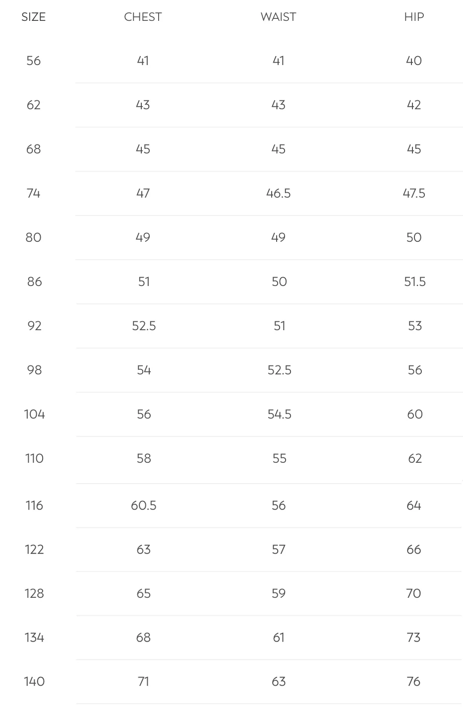| Taille | 104 cm (4 ans), 110 cm (5 ans), 116 cm (6 ans), 62 cm (3 mois), 68 cm (6 mois), 74 cm (9 mois), 80 cm (12 mois), 86 cm (18 mois), 92 cm (2 ans), 98 cm (3 ans) |