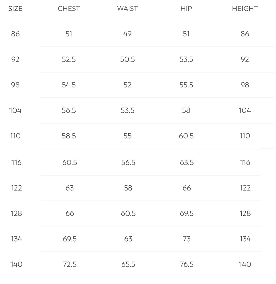 | Taille | 104 (4 ans), 110 (5 ans), 116 (6 ans), 122 (7 ans), 128 (8 ans), 134 (9 ans), 140, 86 (18 mois), 92 (2 ans), 98 (3 ans) |