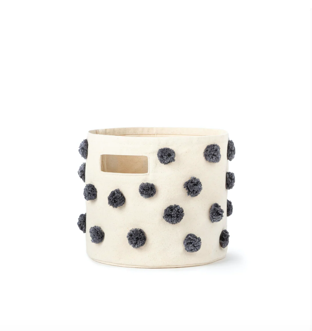 Our hampers are designed to hold clothes, mitts, boots, trucks, balls, blocks, swim suite, beach gear, and everything in between. Each Pom Pom are sewn by hand