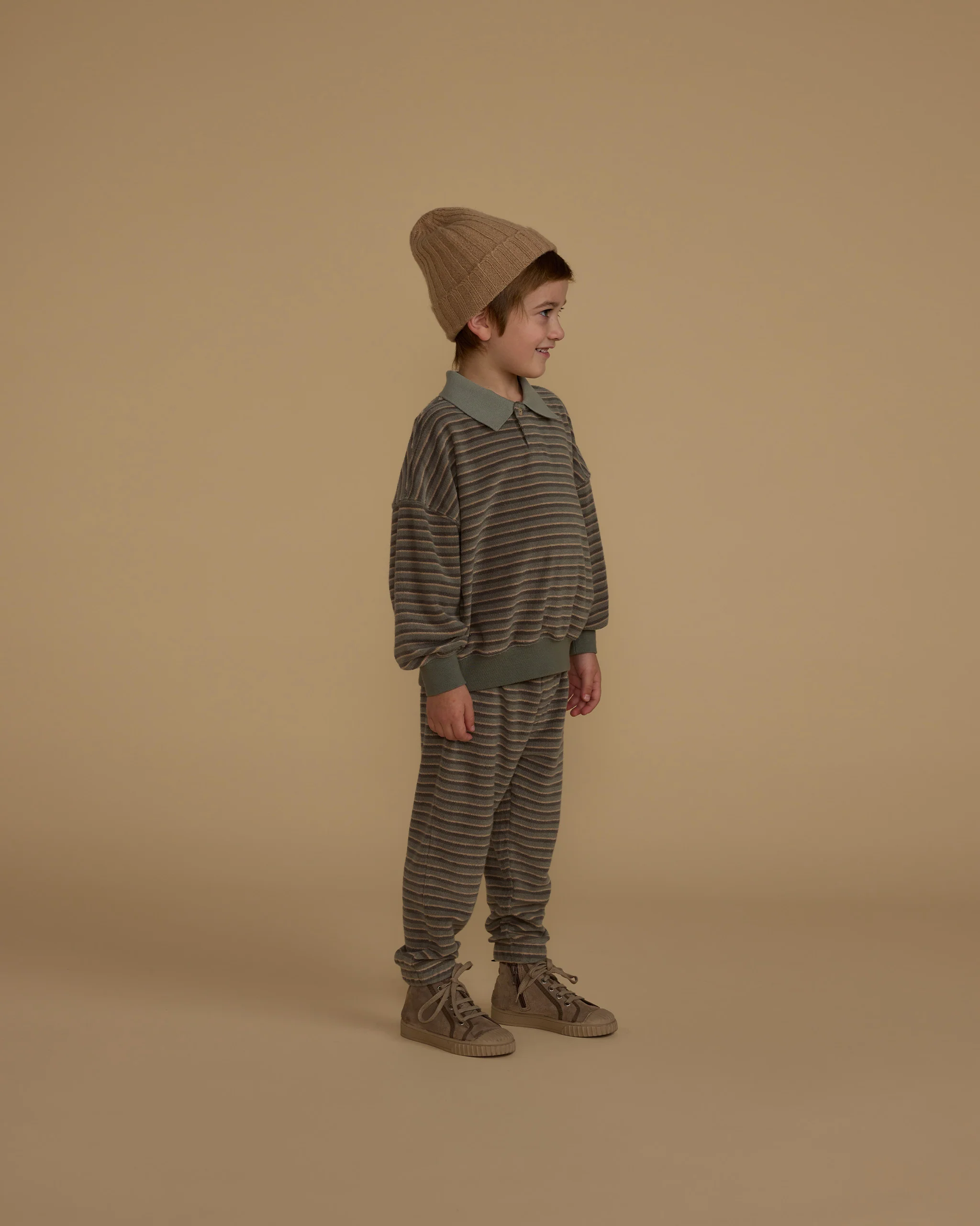 Made from terry cloth, this pair of joggers will keep your little one warm and stylish while staying active. Featuring an elastic waistband, drawstring and elastic leg openings. Pairs perfectly with our ‘Collared Sweatshirt.’