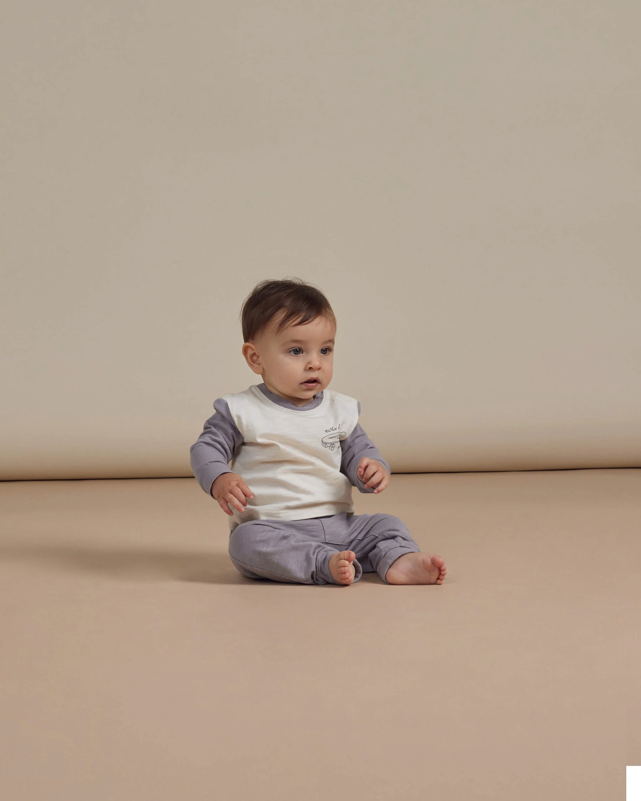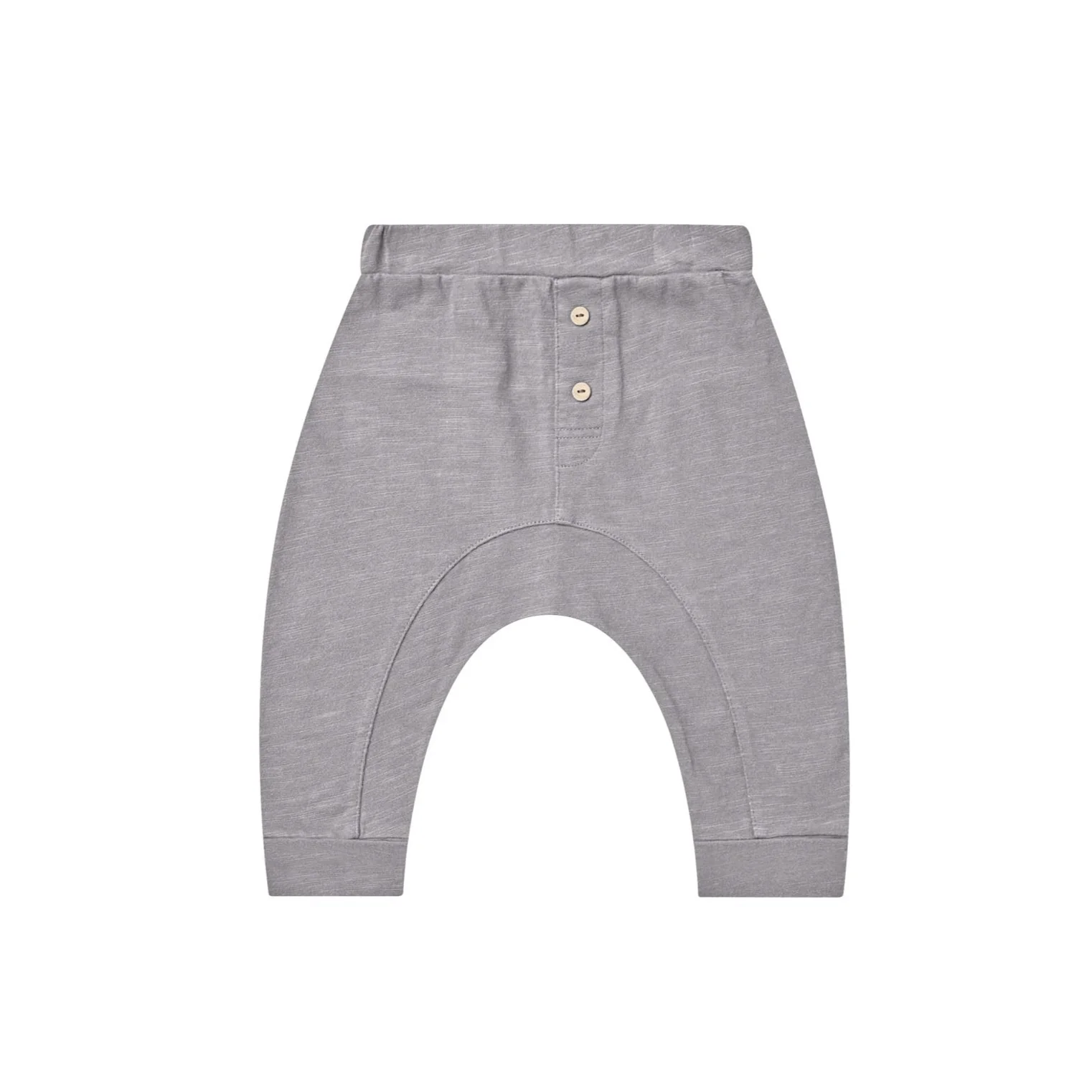 Super-soft slub knit pants with coconut button detail at center front. Featuring rolled leg cuffs, an elastic waistband, and a dropped crotch.
