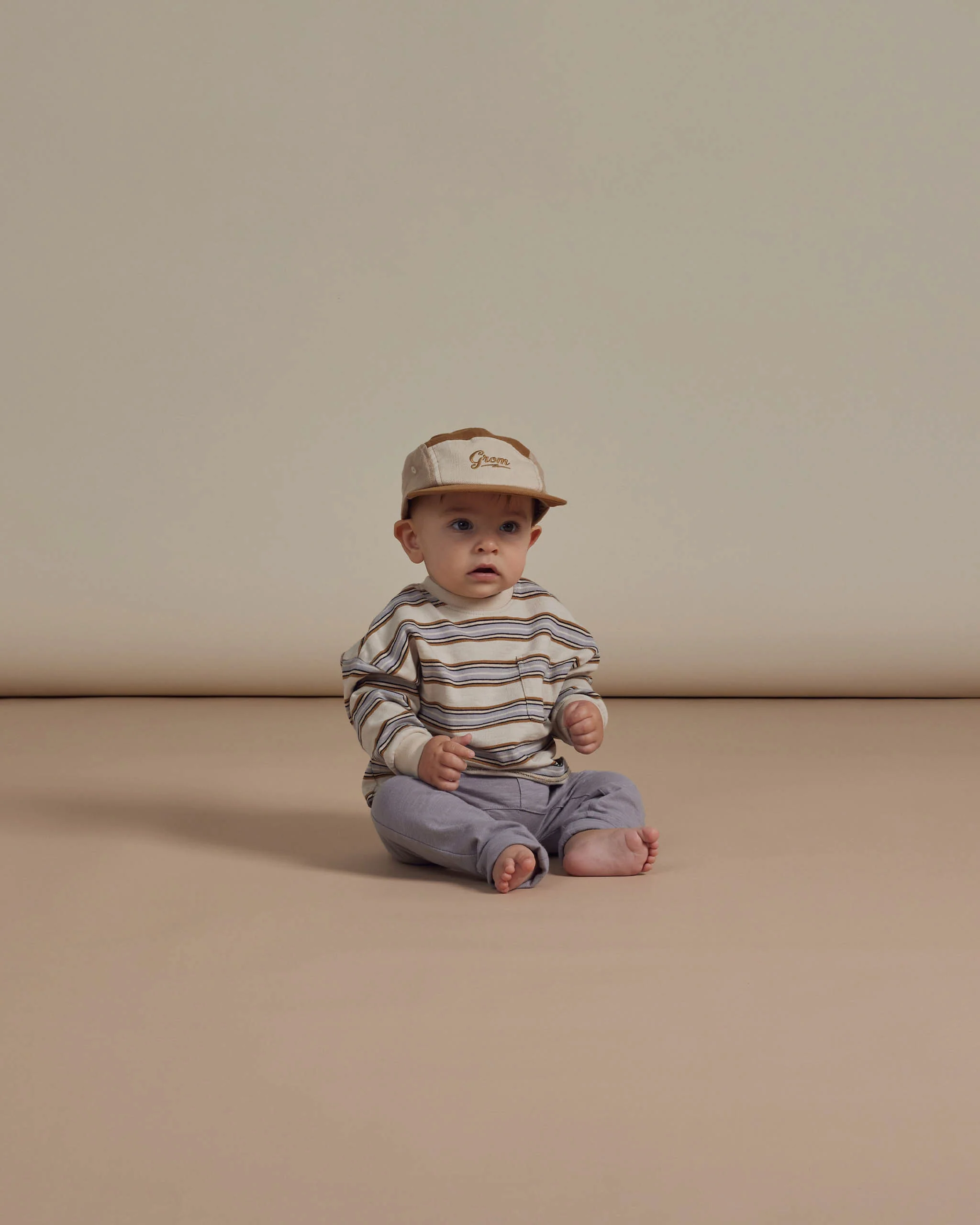 Pantalon en tricot flammé super doux avec bouton en noix de coco au centre sur le devant. Bas de jambes roulés, taille élastique et entrejambe tombant. Couleur : bleu français Entretien : Lavage en machine à froid. Sécher à basse température. Fait de 100% coton — Super-soft slub knit pants with coconut button detail at […]