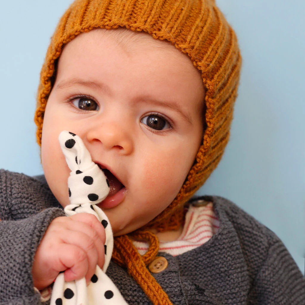 MATIÈRE : Corps en jersey de coton biologique, bonnet en éponge biologique, rembourrage en laine biologique