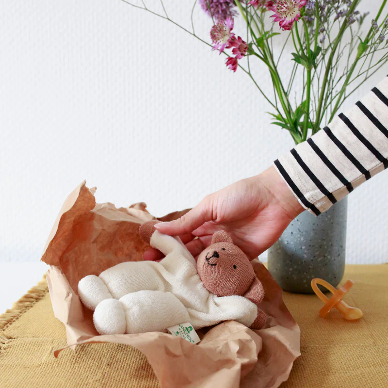 Fabriqué à la main en Allemagne, ce petit ours en peluche est fait de coton éponge certifié biologique et rempli de pure laine, ce qui le rend sans danger pour les bébés qui font leurs dents.