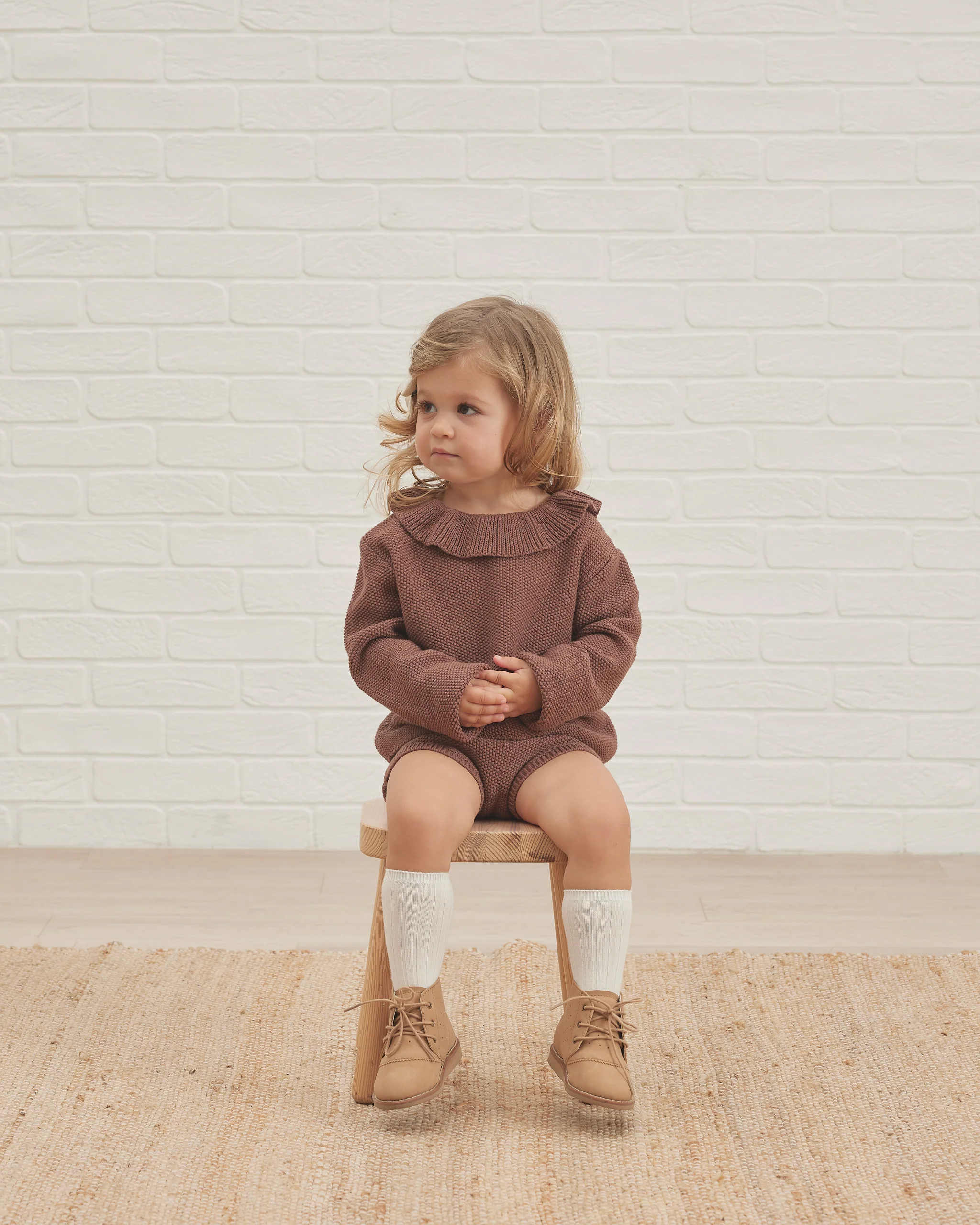 Pull à enfiler avec un col à volants et une fermeture boutonnée à l’arrière du cou. Se marie parfaitement avec nos bloomers en maille.