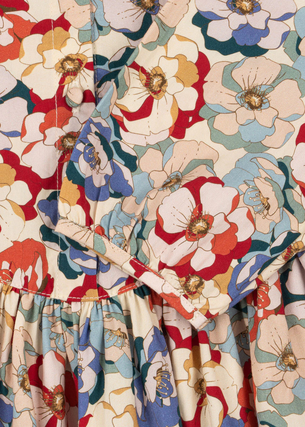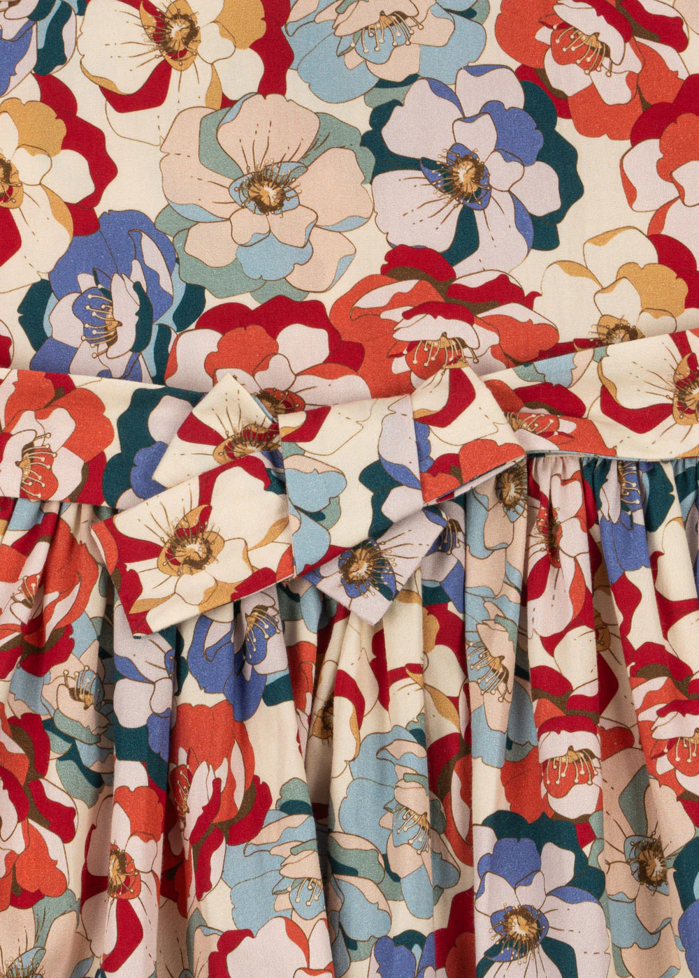 Robe en coton bio avec col rond en dentelle, jupe évasée et manches bouffantes. Boutons recouverts de tissu sur le devant et bretelles intégrées à nouer dans le dos pour un ajustement parfait.