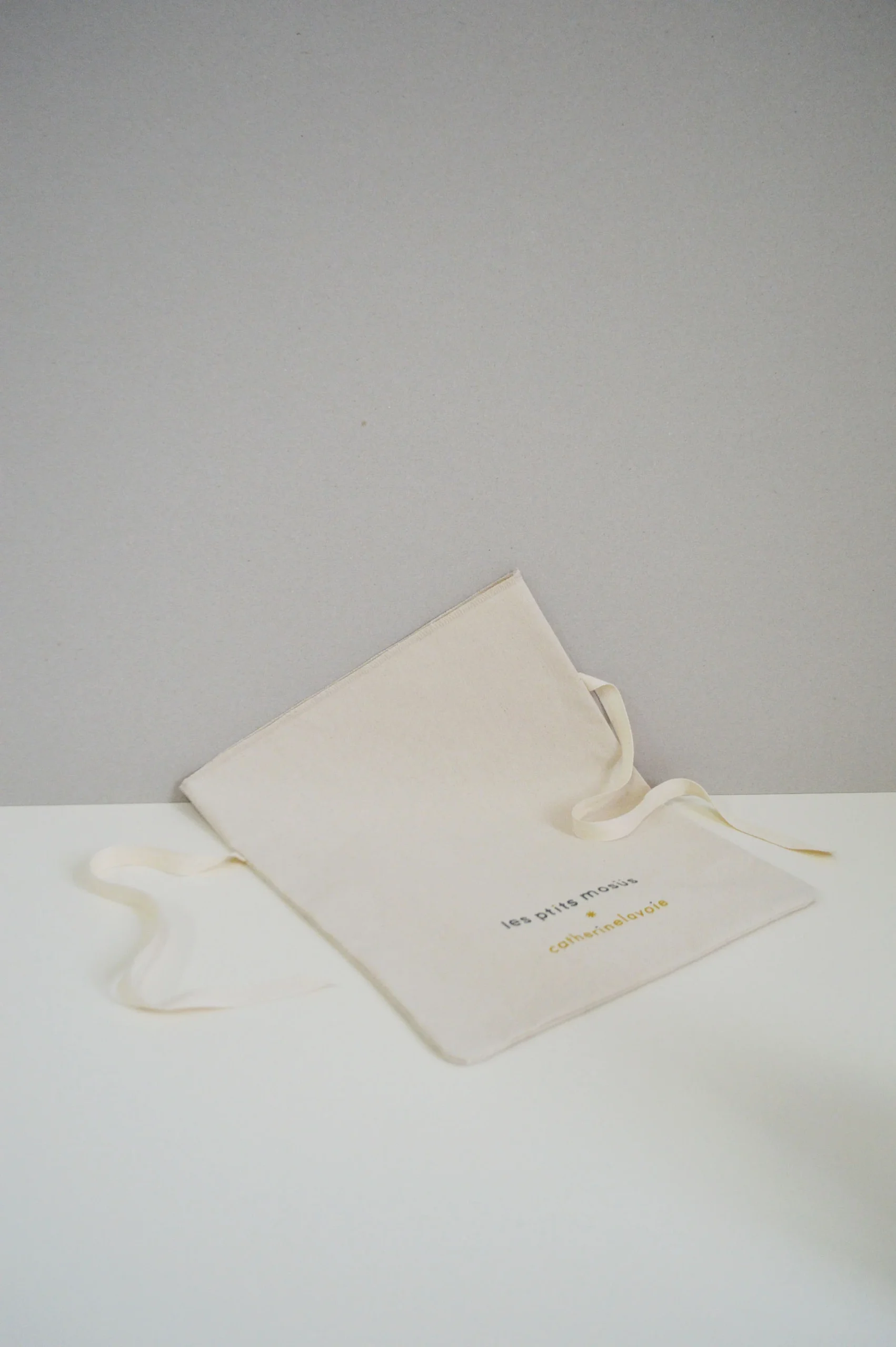 Dimension : 34 X 42 cm, 2 rubans cousus (à même le sac) pour le refermer.