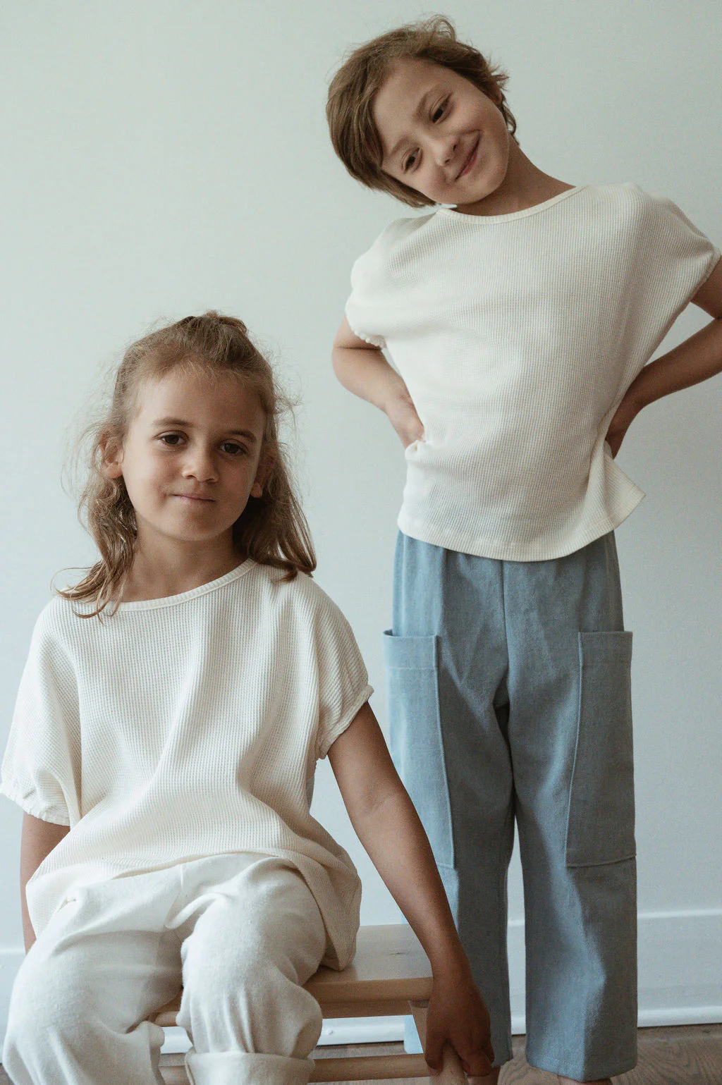 relaxed boxy fit, with subtle elastic arm cuff openings. while it looks simple on the hangar, when worn, the fit is cool and effortless. made to be loved equally by boys + girls.