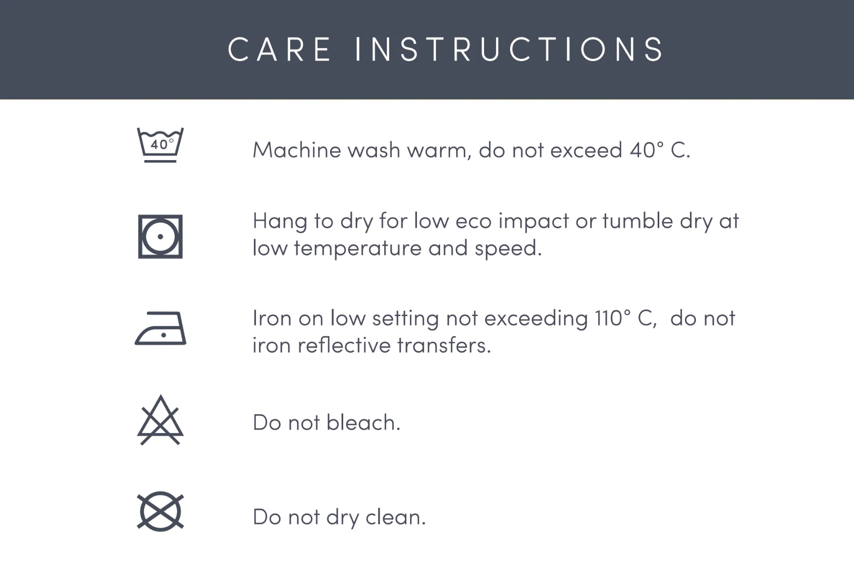 - Machine wash warm, do not exceed 40°C